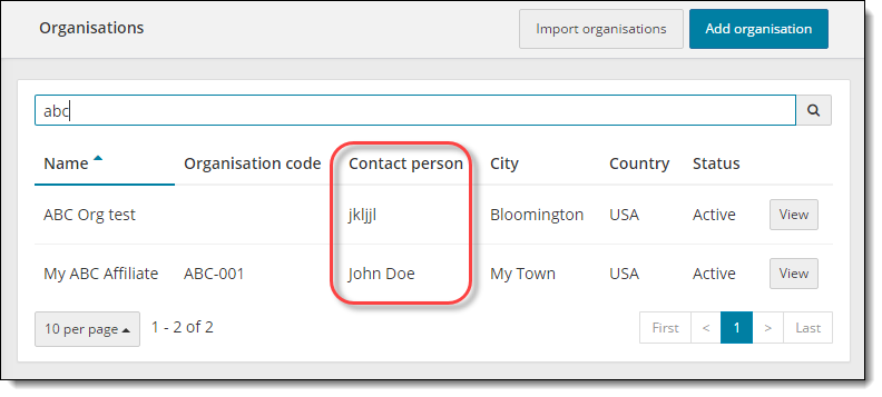 The contact person's information appears on the Organizations list page once you save the organization.
