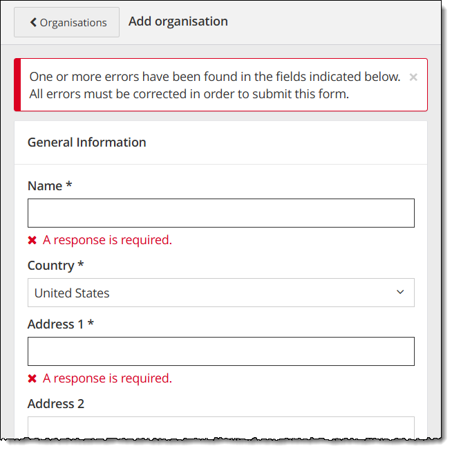 If any mandatory fields are not completed, an error message is displayed at the top of the Add organization page. The mandatory field is highlighted in red and a message appears below the field stating a response is required.