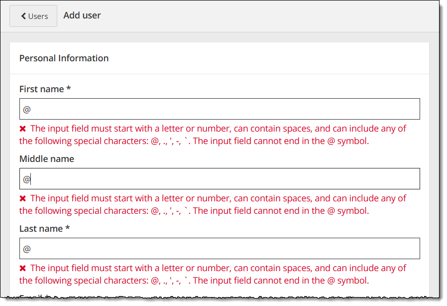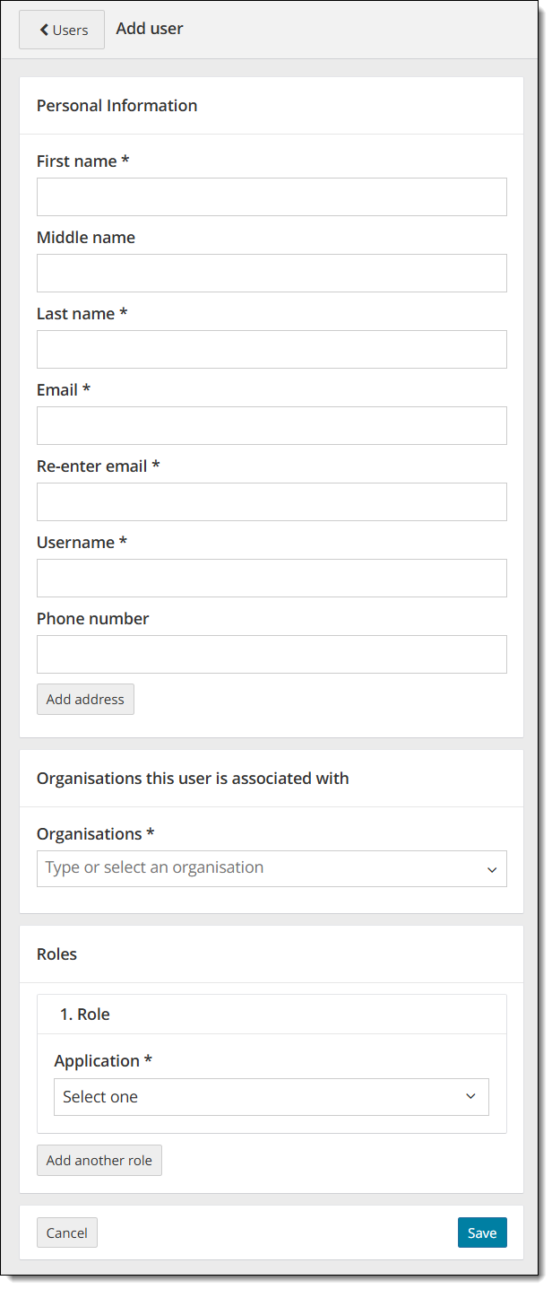 from the User list page. - Enter a First name, optional Middle name, and Last name for the user.