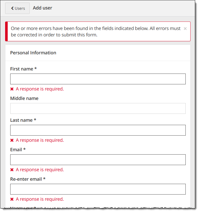 When you create a new user account, you are not required to provide the address information. If you choose to provide an address for the user, you must supply all the mandatory address fields before saving the new user account. |