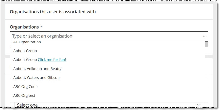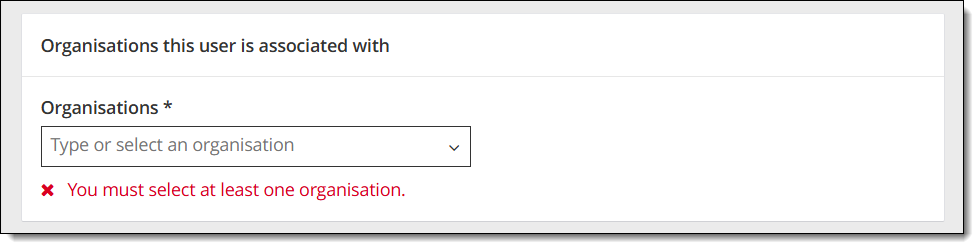 - To add the user account to additional organizations, place your cursor below the organization you just added. Select an organization from the Organizations list.