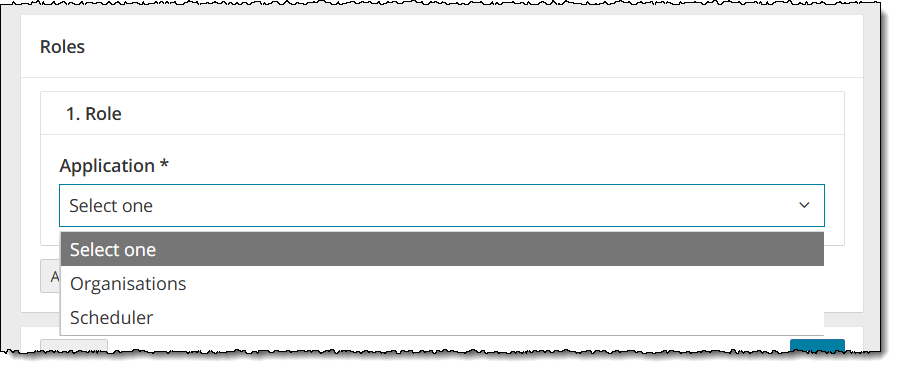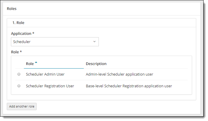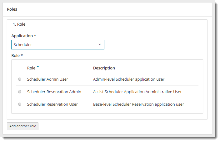 You must select what type of user you wish to add. You may add a Scheduler user role (most users will be Scheduler users) or you may add an Organizations user role. The roles section includes an application drop-down list.