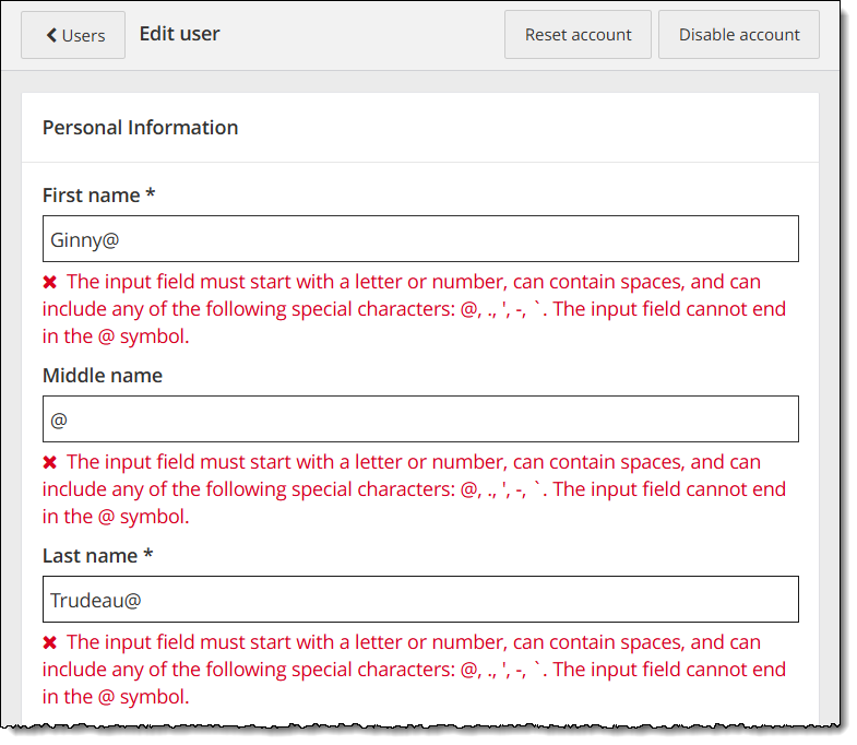 You may edit any of the user's personal information, but you must provide information for all the mandatory fields.