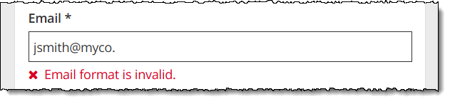The email address must be a valid email format. When you start typing in the Email field the error message appears. Once you have typed in a valid email format the message disappears. The system does not verify that you have typed a valid email address, it just verifies that the format is valid.