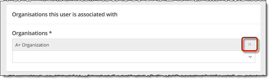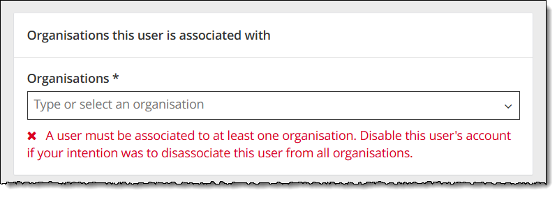 If you remove all the organizations for the user, a message appears below the Organizations field stating a user must be associated with at least one organization.