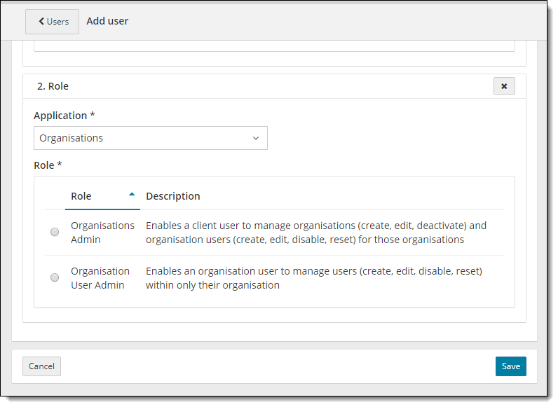 To add the user to additional organizations, place your cursor below the organization list. Select an organization from the Organizations list.