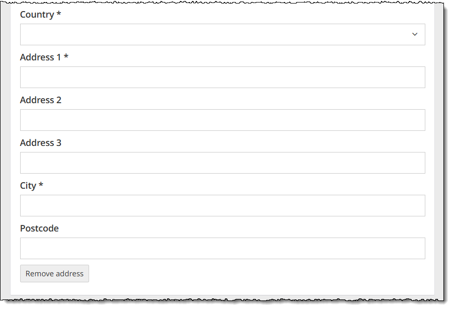 The mandatory fields will change depending upon the Country selected when entering address information to a user account. If you do not know all the required address fields when you edit the user account, you are unable to save the user account to the system. You can select Remove address and add the address information later. When you select Remove address, all the address fields are cleared, and you are returned to the basic Add user page. |