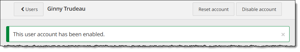 A confirmation message appears at the top of the page confirming the user account has been enabled and the Disable account button appears.