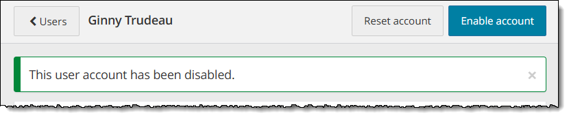 A confirmation message appears at the top of the page confirming the user account has been disabled and the Enable account button appears.