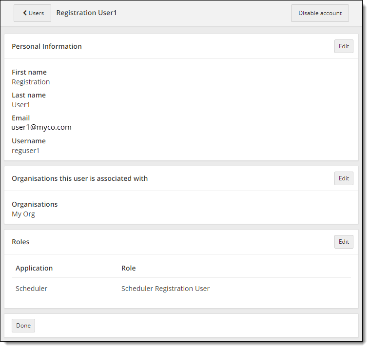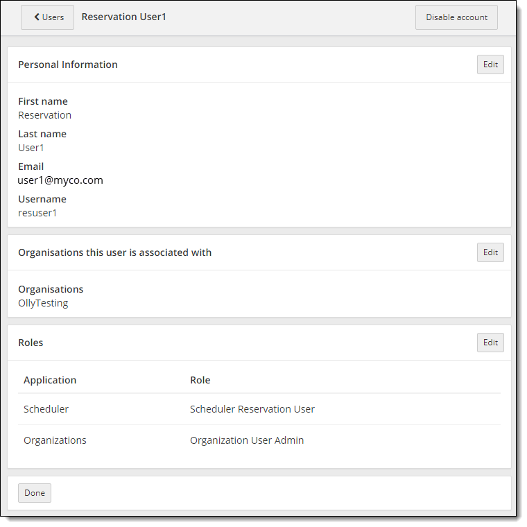 button in the Personal Information, Organization associations, or Roles sections. - See the Edit User Accounts topic for details.