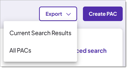 - Select the Export drop-down button above the list of PACs and select either Current Search Results or All PACs from the menu.