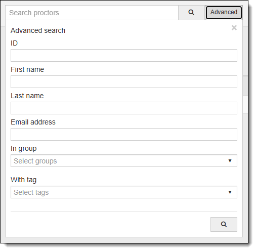 The advanced search function allows you to search for proctor accounts using multiple fields. The basic search only allows you to search for a proctor account based on content in a single field. You can search by Proctor ID, First name, Last name, Email address, groups, or tags.