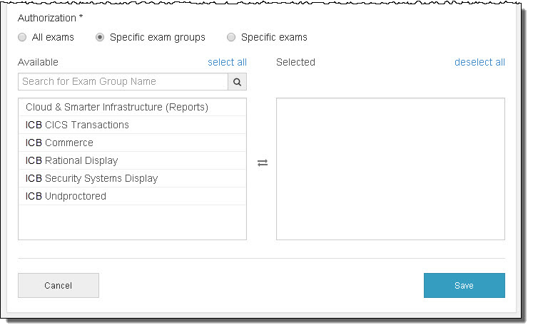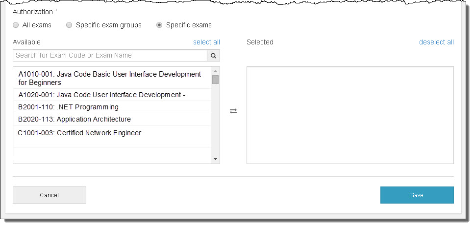 The select all link behaves differently than the All exams option. The All exams option applies all the client's Client proctored - no appointment required exams to the Authorization. Use the select all link after filtering the list of exam groups. For example, filter the list to display all exam groups for electrical engineering. Then select the select all link. This takes all the exam groups that have been filtered and displayed in the Available column and applies them to the Authorization in the Selected column. |