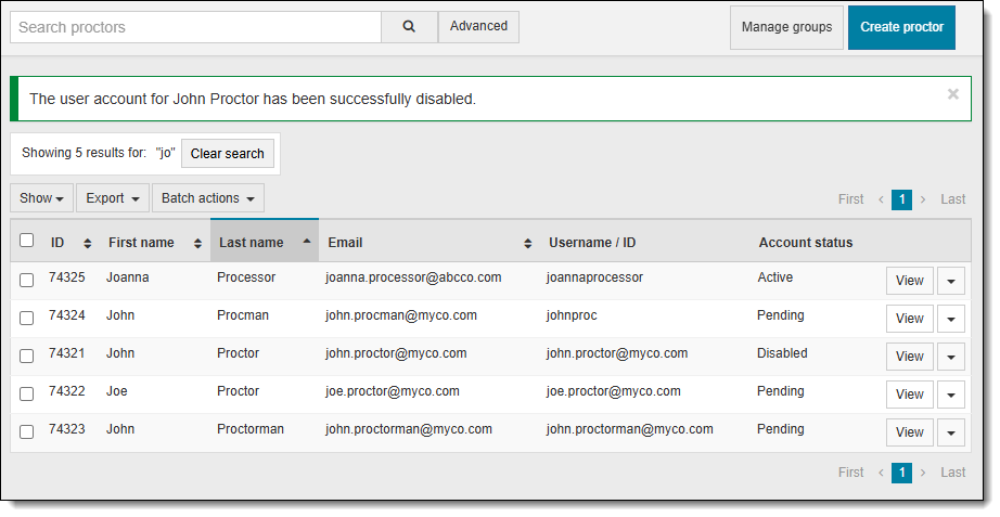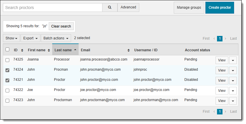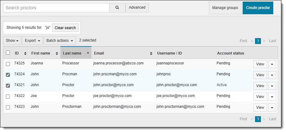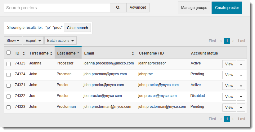 When searching for proctor accounts by first name, last name, email address or proctor ID, you can enter one character or a number of characters in each of the fields. The system locates all proctor accounts that match all of the criteria. For instance, if you search for proctors with first name "jo" and last name "proc", all proctors that have Jo somewhere in their first name and that have proc somewhere in their last name are displayed.