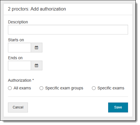 Once you have named the authorization, set the start and end dates, and assigned the exams, you are ready to save the authorization.