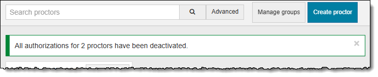 A message states all authorizations for the number of selected proctors have been deactivated.