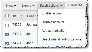 - Select the Batch actions drop-down menu and select Deactivate all authorizations.