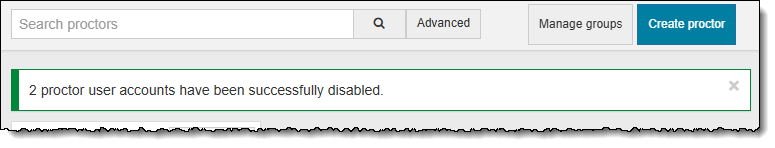 The selected proctor accounts are disabled. A message identifies the number of user accounts that were disabled.
