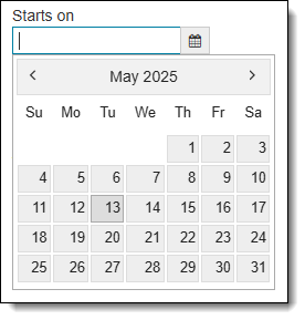 - Use the Month forward and backward buttons to locate the desired start date. Select the desired date on the calendar.