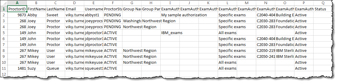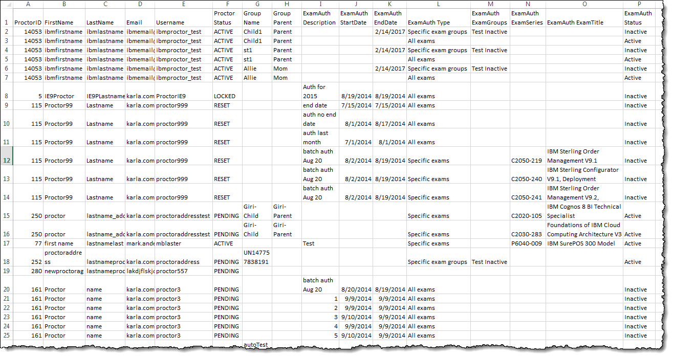 The *.csv file export includes the ProctorID, First Name, Last Name, Email, Username, Proctor Status, Group Name, Group Parent, ExamAuth Description, ExamAuth StartDate, ExamAuth EndDate, ExamAuth Type, ExamAuth ExamGroups, ExamAuth ExamSeries, ExamAuth ExamTitle, and ExamAuth Status. The list is sorted by Last Name. The file is named using the following naming convention and placed in the Downloads directory: proctorsyyyymmdd_hhmmss.csv |