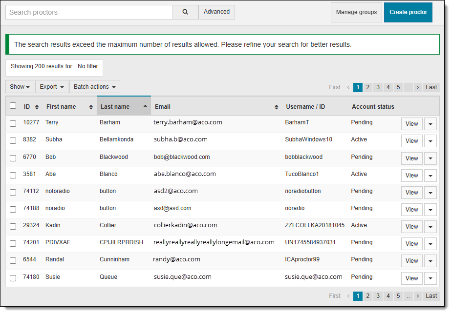 You can search for proctor accounts by typing in text from any part of the following fields: First name, Last name, Email address, or Proctor ID.
