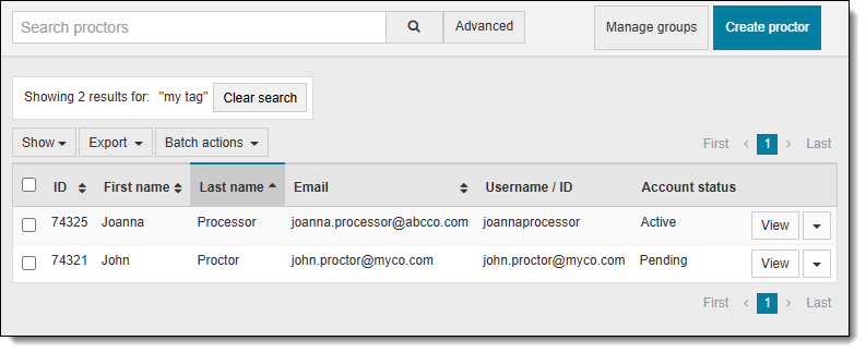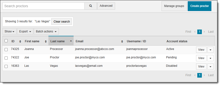 If you have a large list of Proctor accounts, it is not efficient to tab through the list of accounts. You can search for a proctor by the First name, Last name, Email address, or Proctor ID. If you want to locate a proctor account by searching for both a first and a last name, you must use the Advanced search functionality. See Advanced search for a proctor account.