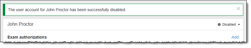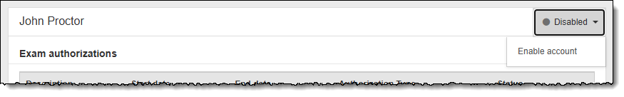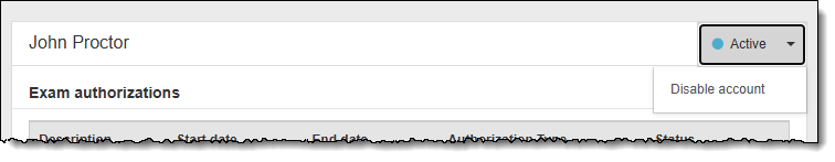 Admin users have the ability to disable a proctor account to prevent the user from proctoring/unlocking exams. User accounts in all statuses (Pending, Locked, Reset, and Active) can be disabled.