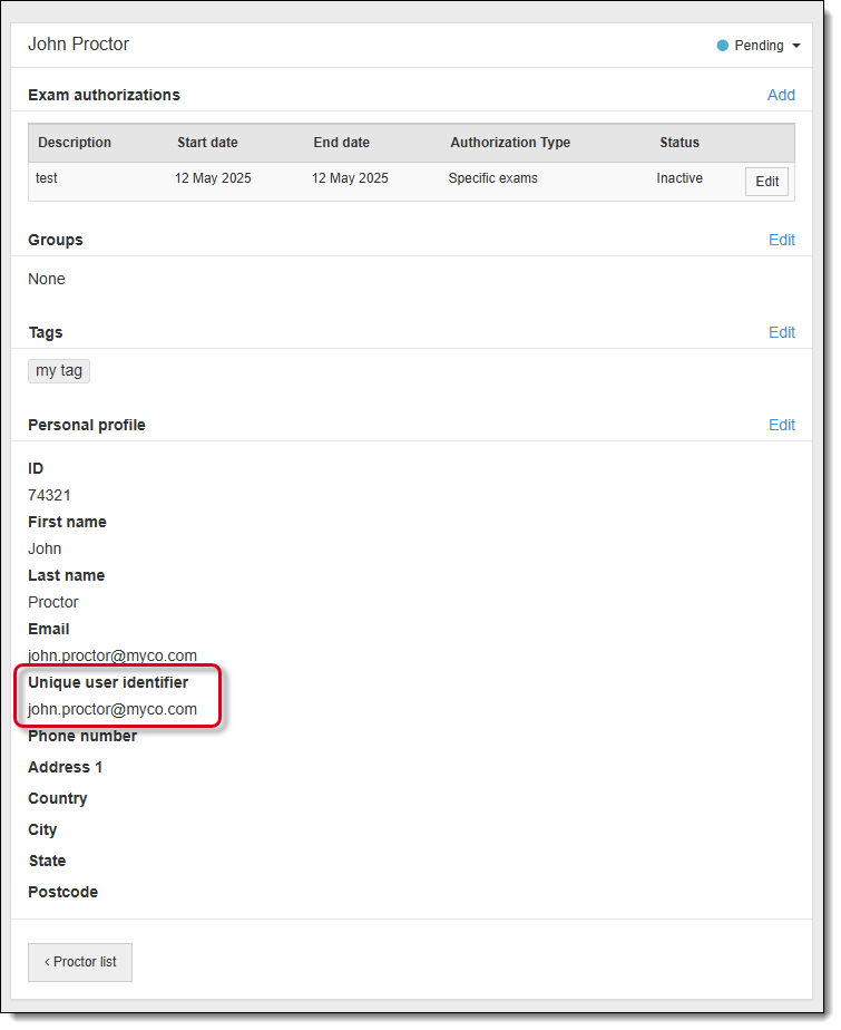 For SSO proctors, the Personal profile section displays the SSO proctor's Unique user identifier instead of the Username that is displayed for standard Navigator proctors.