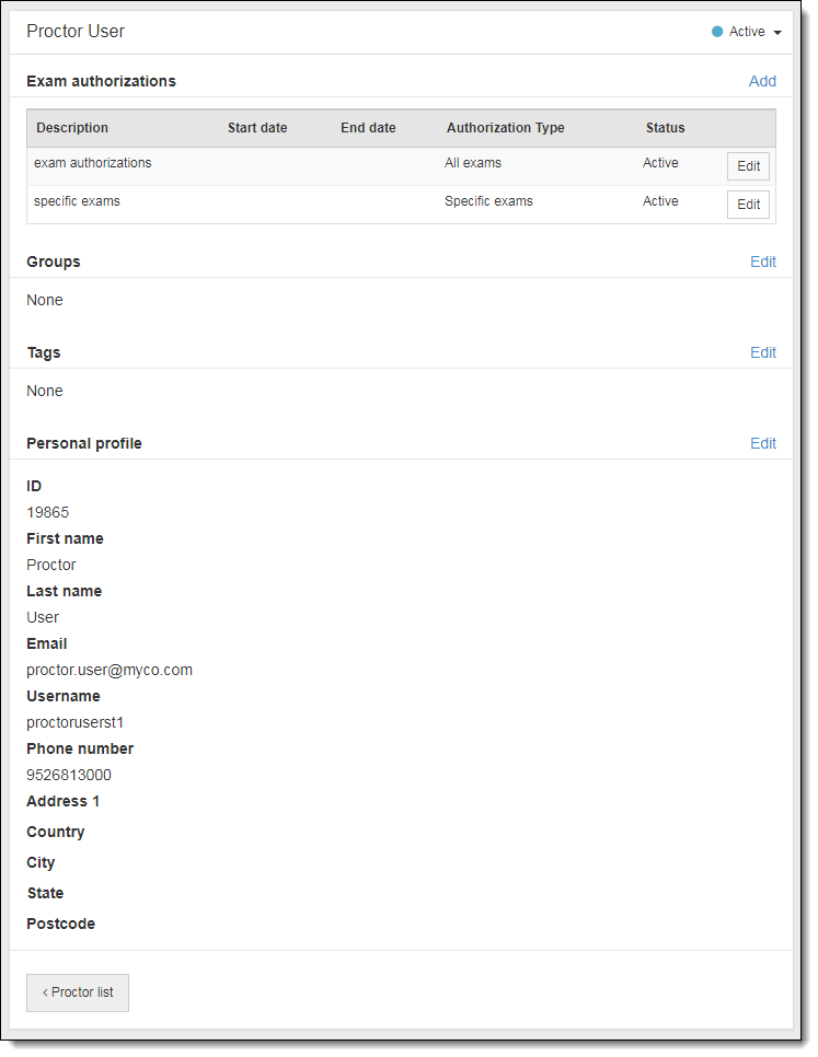 Once a proctor account has been created, the account is added to the list of proctors. You must open the proctor account to view the proctor's demographic information (name, username, email, address, etc.) and the list of authorizations assigned to the proctor.