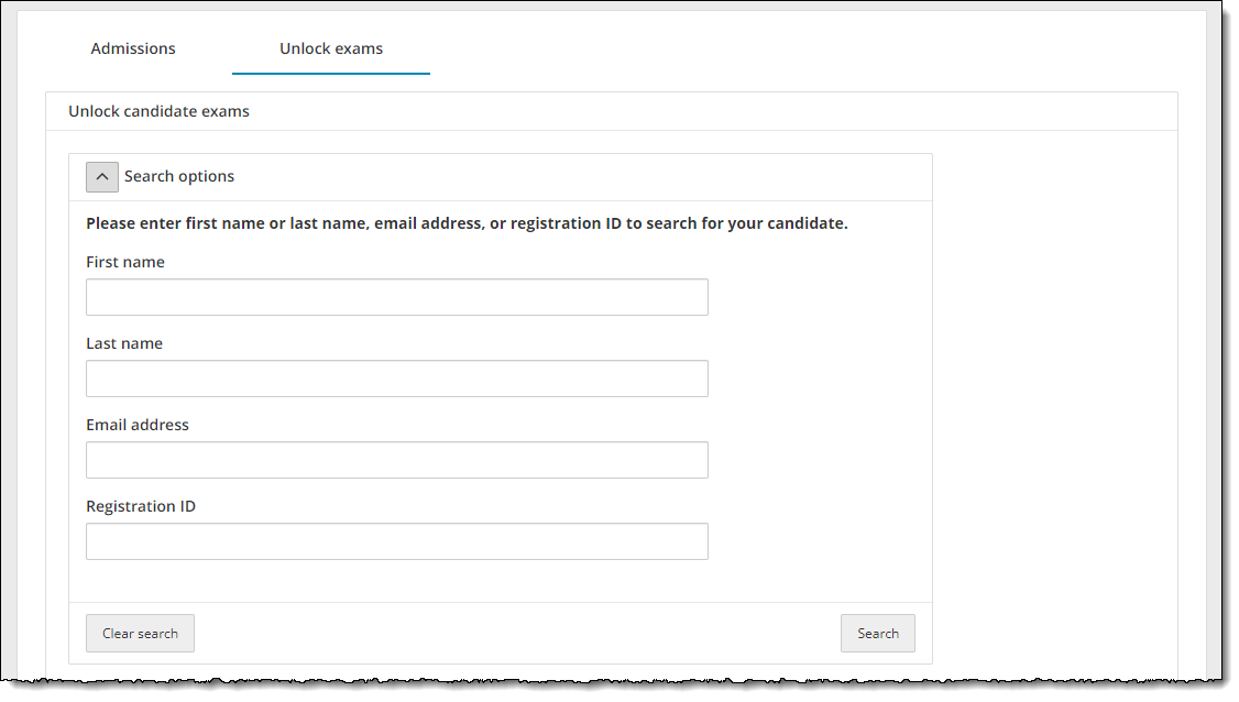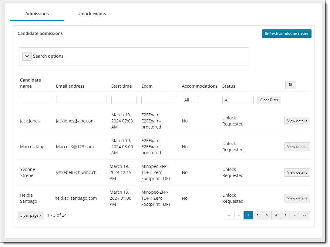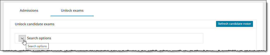 The Refresh roster button is hidden when the Search options are displayed on the page. The Refresh roster button appears once you hide the Search options fields. If you select the Refresh roster button with the Unlock exams roster filtered by the search criteria, only those registrations that match the search criteria are displayed. You must display the search options and select the Clear Search button. Then all the candidates appear on the roster list when you refresh the roster. |