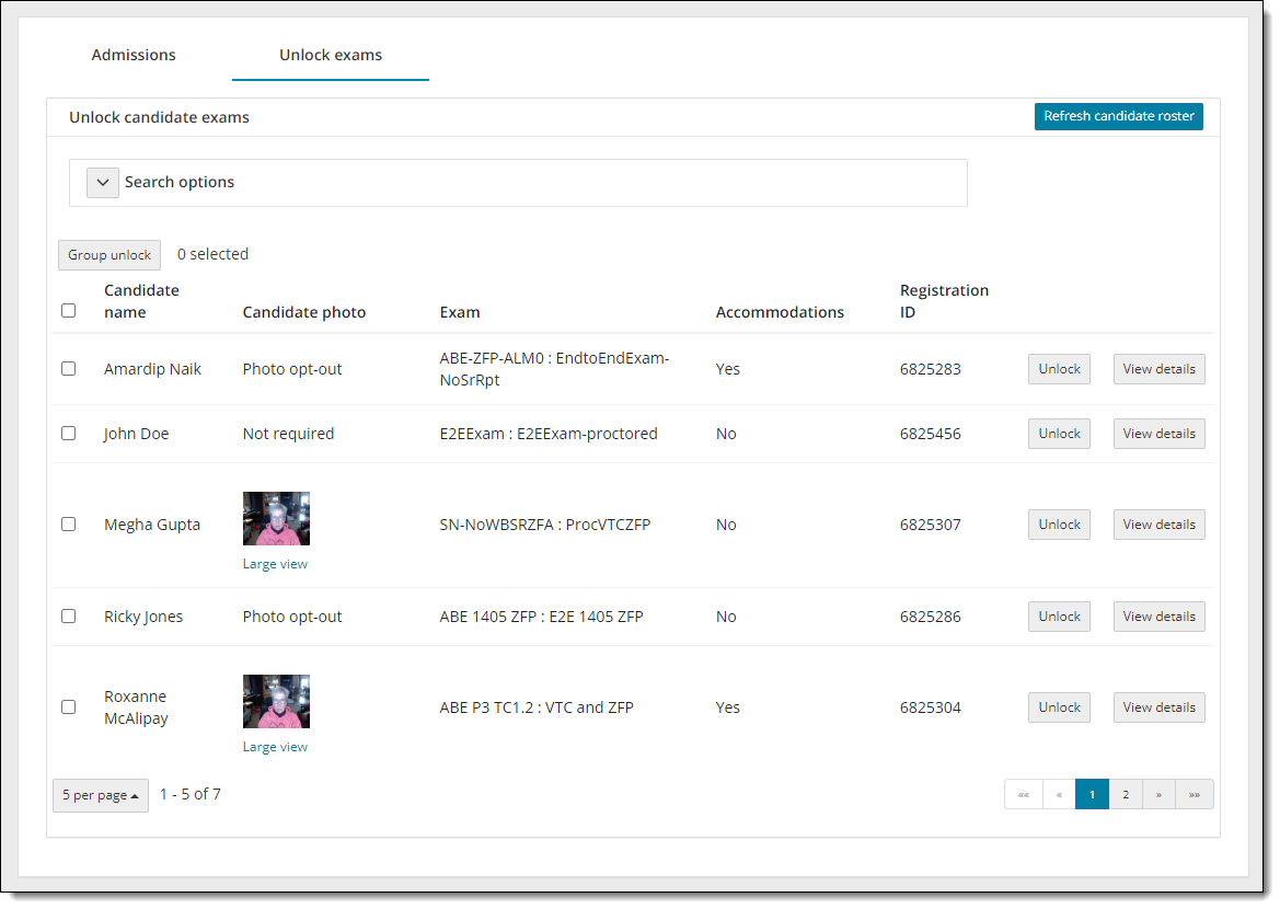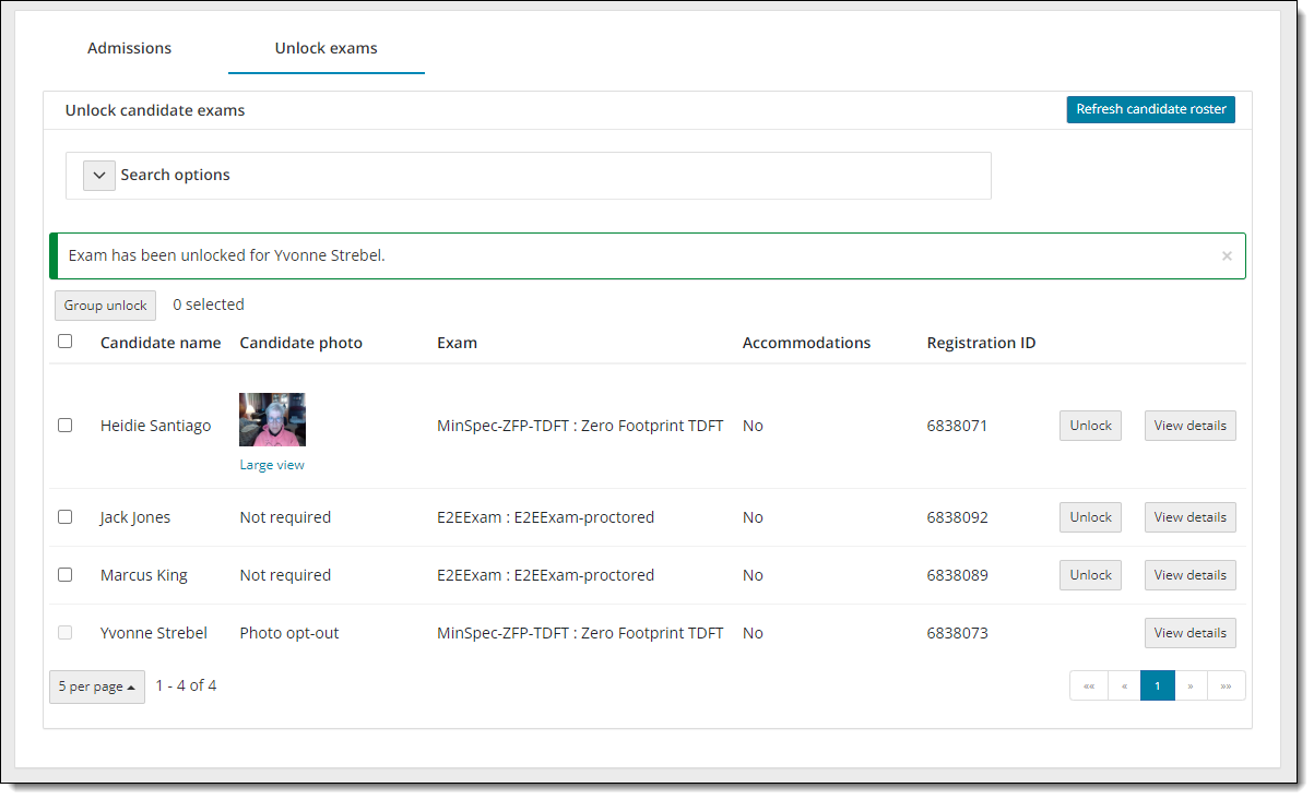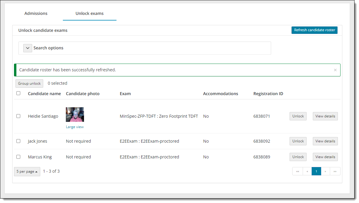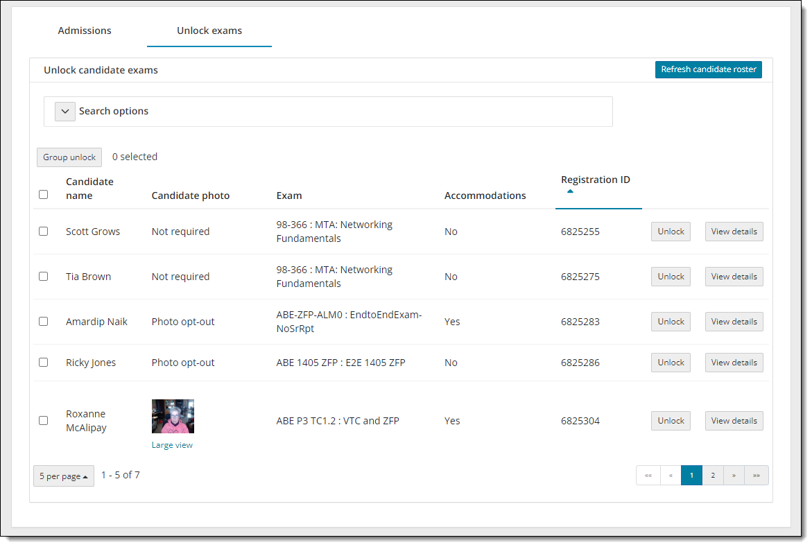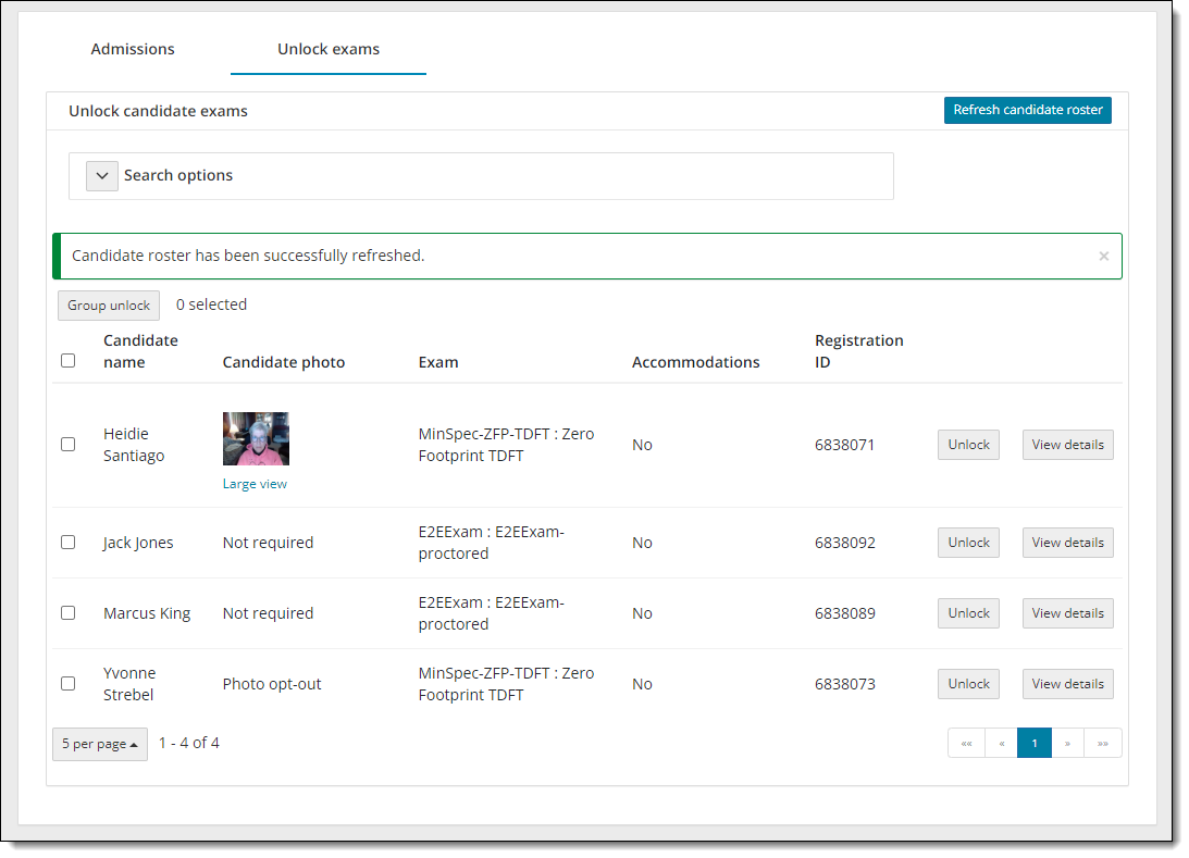 - Select the Refresh candidate roster button. A message states the roster has been refreshed. All candidates that were admitted, and that have submitted an unlock request, are listed on the roster with an exam status of locked. The candidate photo is displayed for those registrations that require photo capture. By default, only the first 5 exam registrations are listed in ascending order by Candidate name.