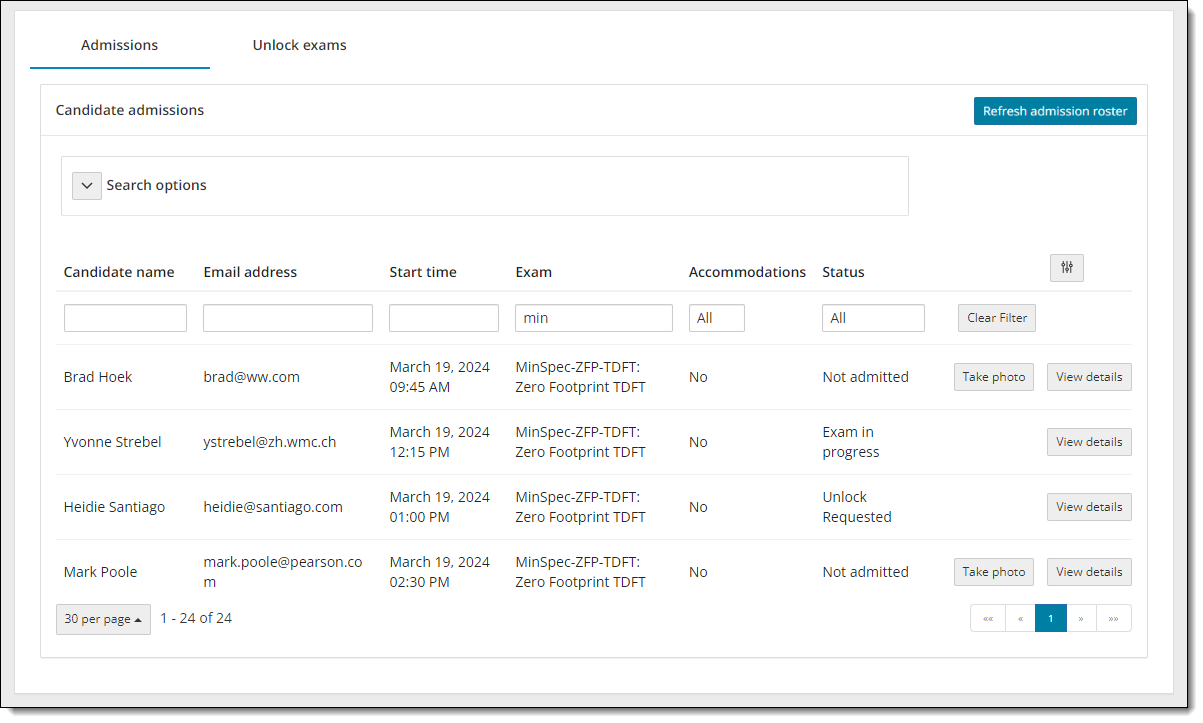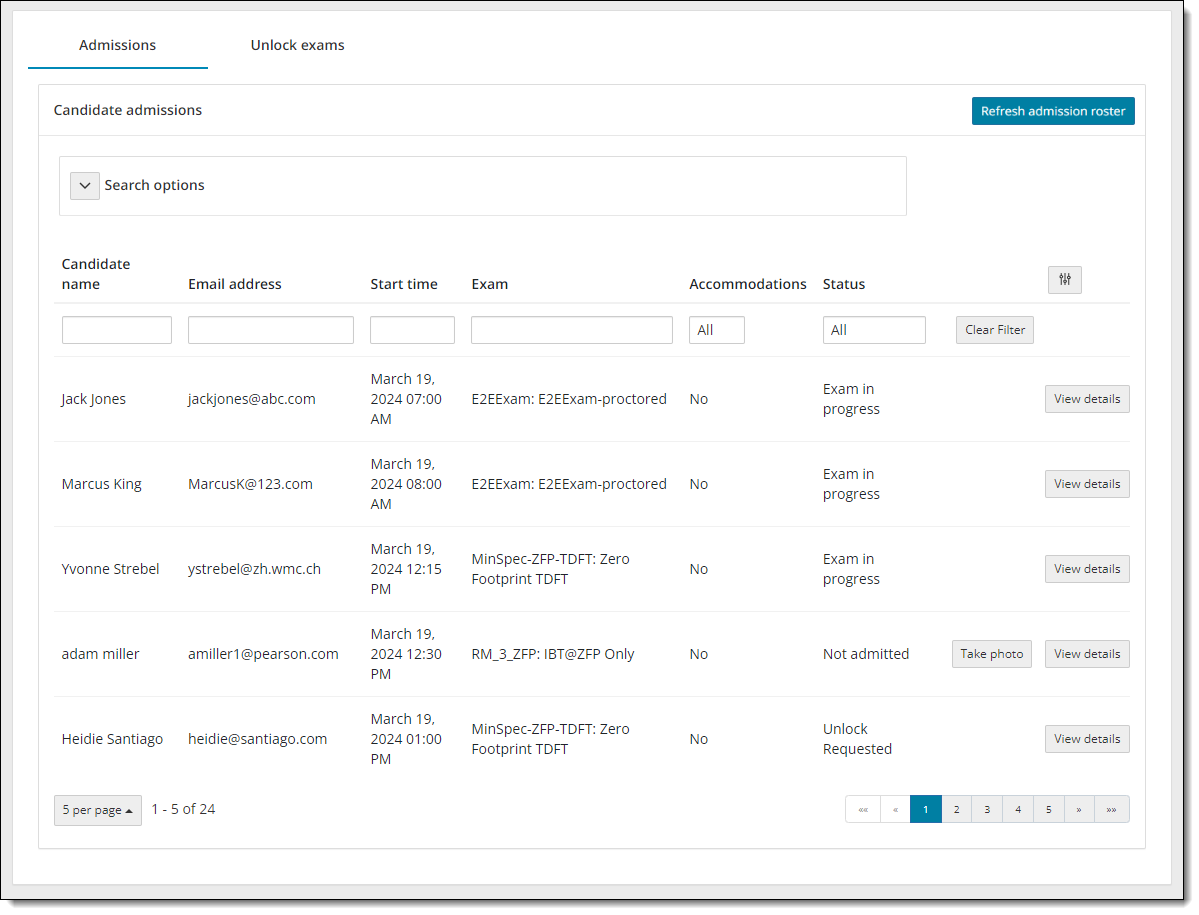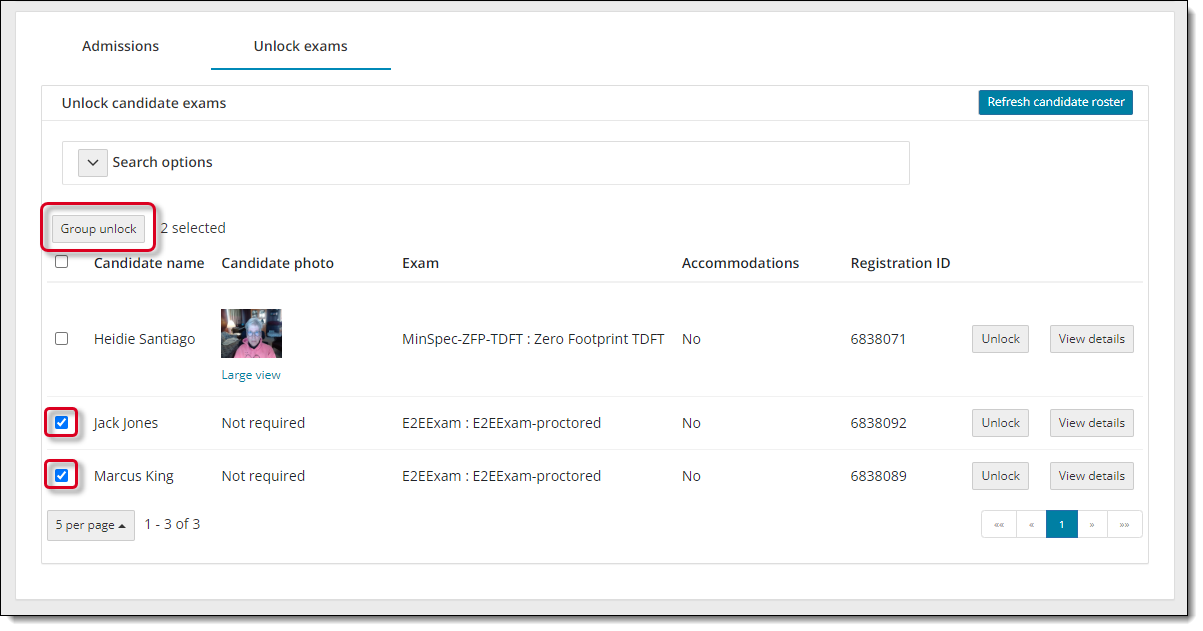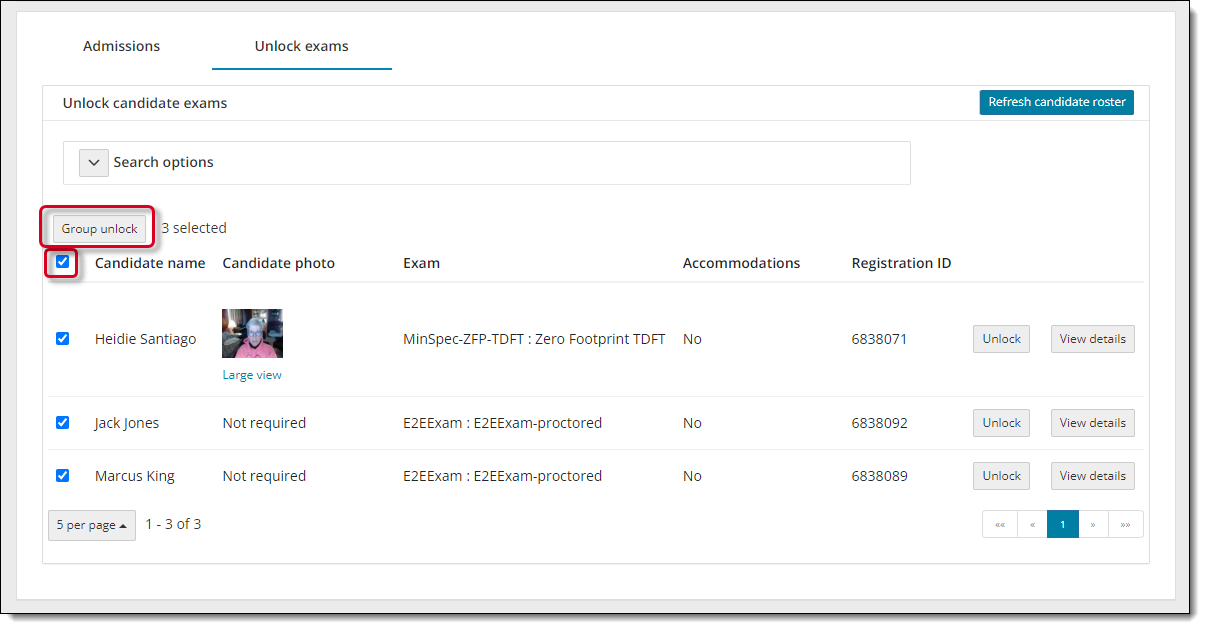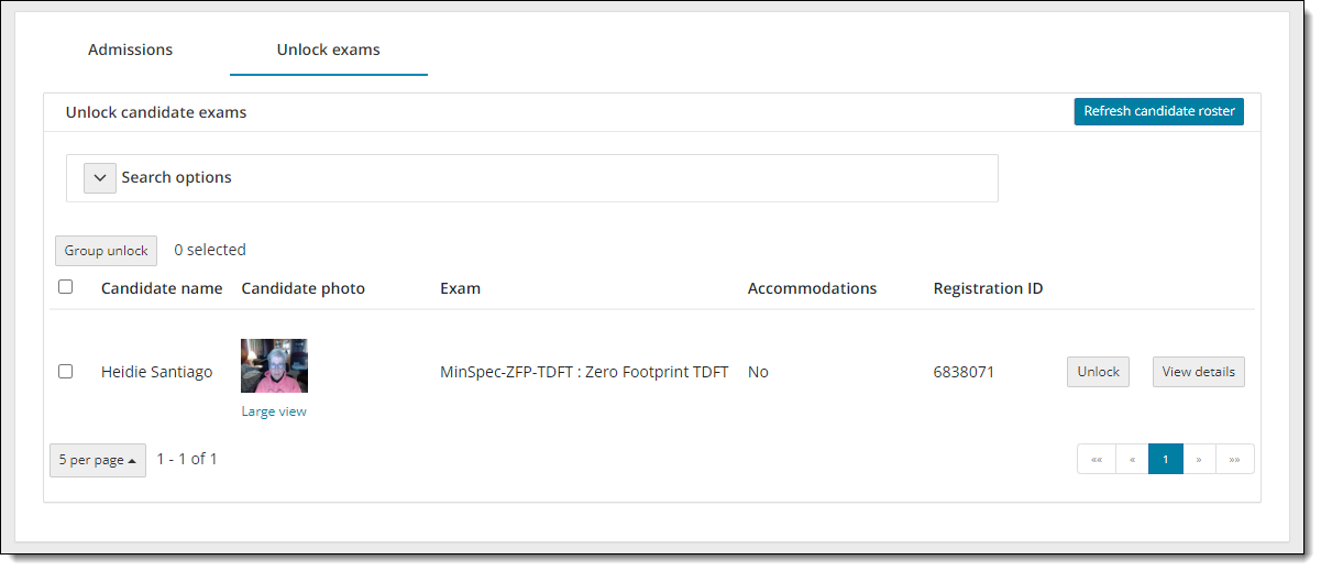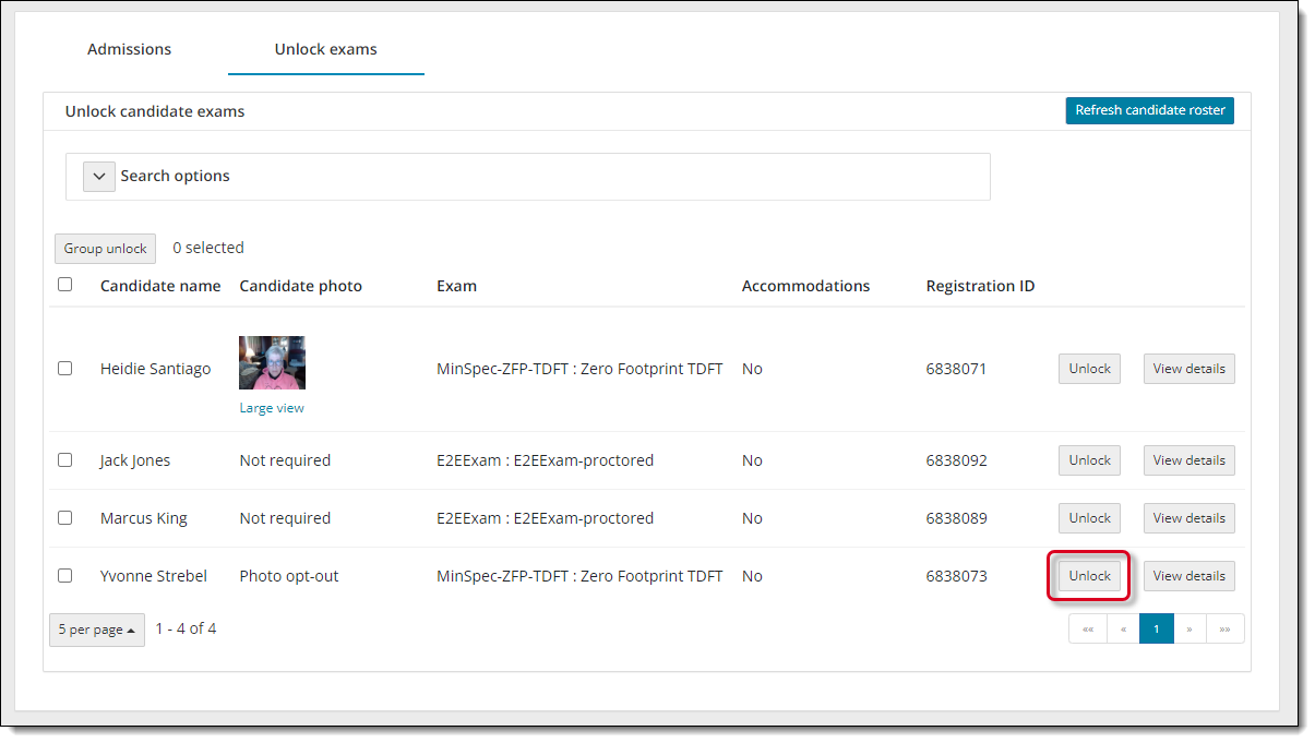 - Select the Refresh candidate roster button. A message states the roster has been refreshed. All candidates that were admitted, and that have submitted an unlock request, are listed on the roster with an exam status of locked. The candidate photo is displayed for those registrations that require photo capture. By default, only the first 5 exam registrations are listed in ascending order by Candidate name.