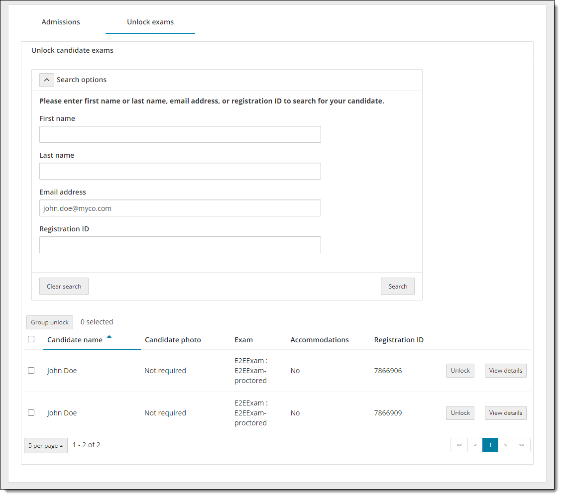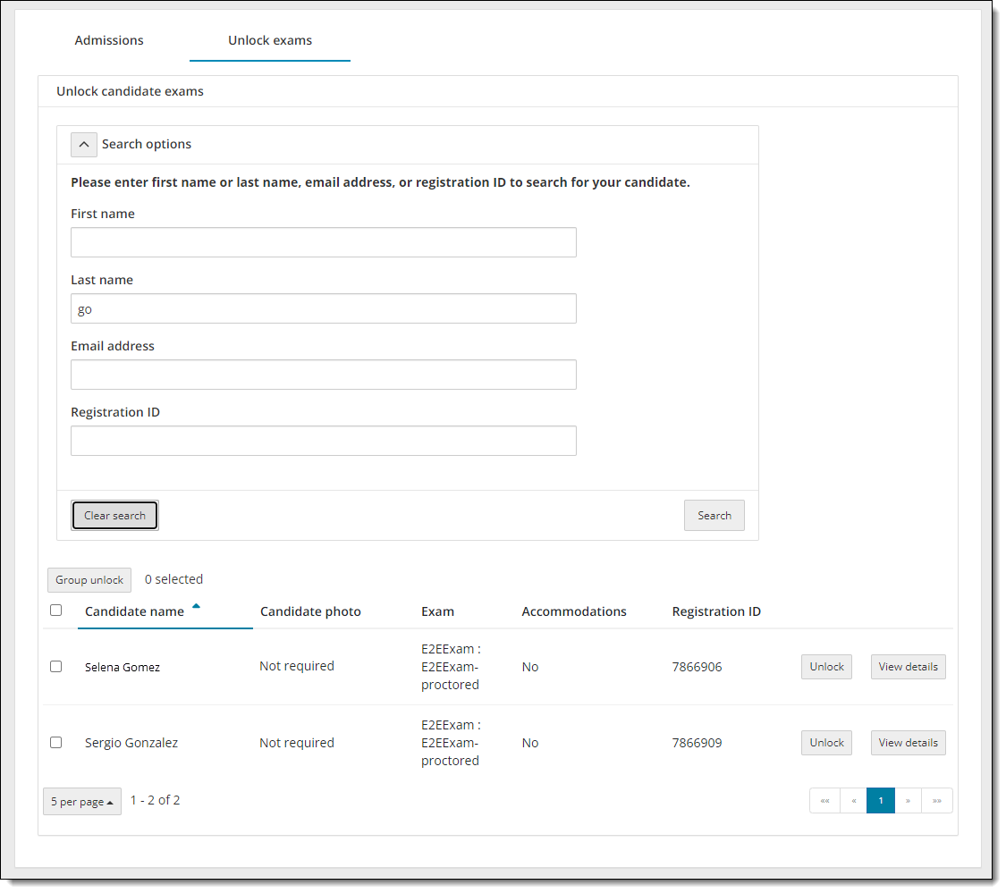 If you are only displaying a subset of the complete set of candidates on the Unlock exams tab, for example 5, only the first five exam names are displayed in ascending order on the first page in the list. A different set of candidates may be displayed on the page than was showing when the list was sorted by candidate first name. The entire list of exams is sorted and the first five exam names are listed in ascending order.