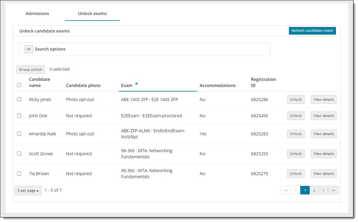 - Locate the desired candidate on the Unlock candidate exams roster.