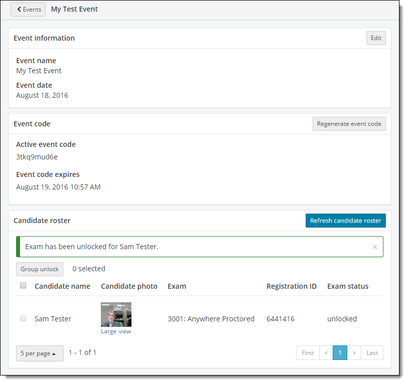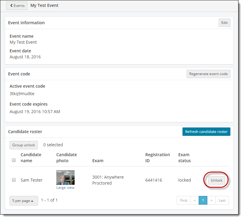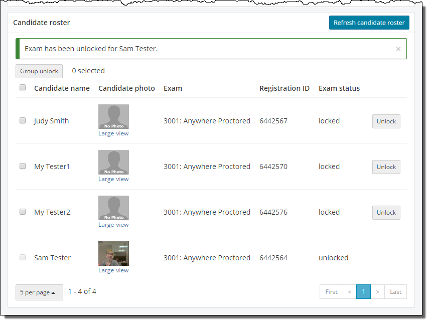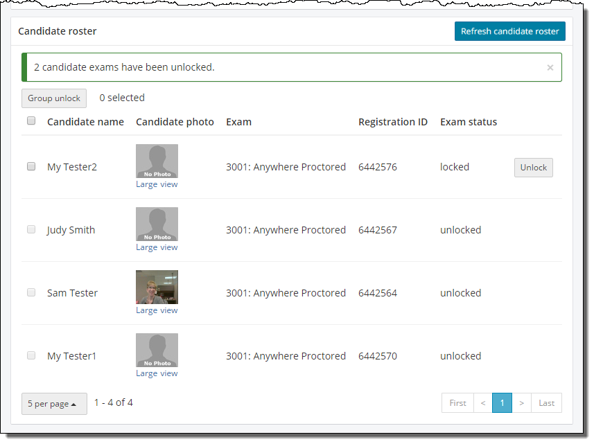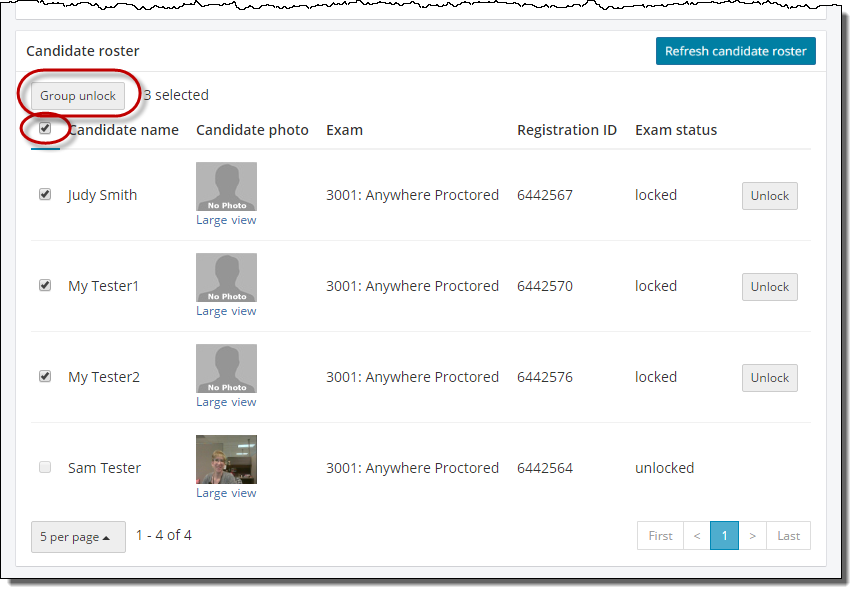 By default the Candidate roster displays the first 5 candidates that have admitted themselves using the Event code. If you have a large event where you have more than 5 candidates listed on the roster, you can use the page links in the bottom right corner of the page to scroll through the list of candidates waiting to have their exam unlocked.