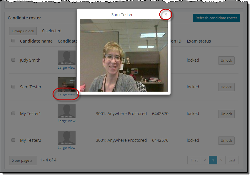 To verify a candidate's identity when a candidate photo has been captured, locate the desired candidate in the list and select the Large view link. The photograph of the candidate opens in a larger window. Select the Close button when you are finished viewing the candidate photo.