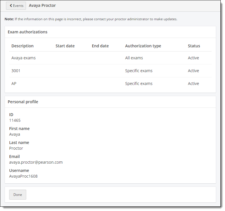 Proctors can easily view a list of the Client proctored - no appointment required exam authorizations they have been assigned by viewing the proctor information page. An exam authorization may be set up for a single exam or a group of exams. The proctor information page lists the exam authorizations, not the specific exams the proctor is authorized to proctor. This page also includes basic user information for the proctor.