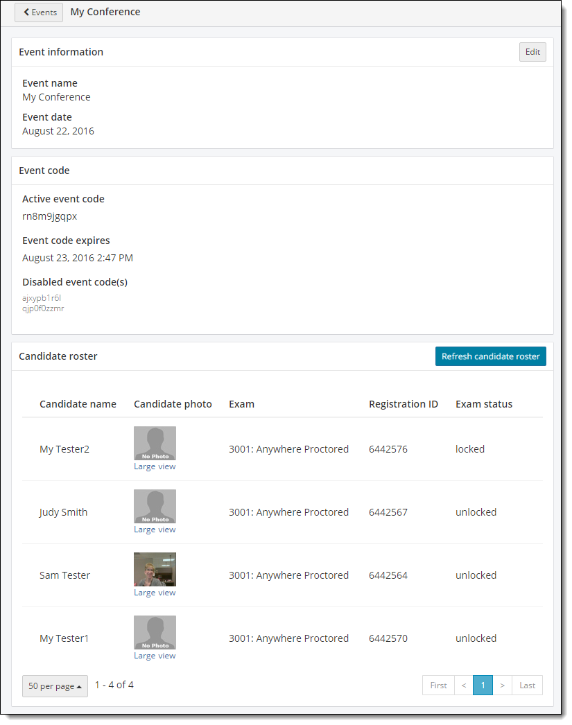 Once candidates have entered event codes, the candidates are listed in alphabetical order by last name on the Candidate roster.