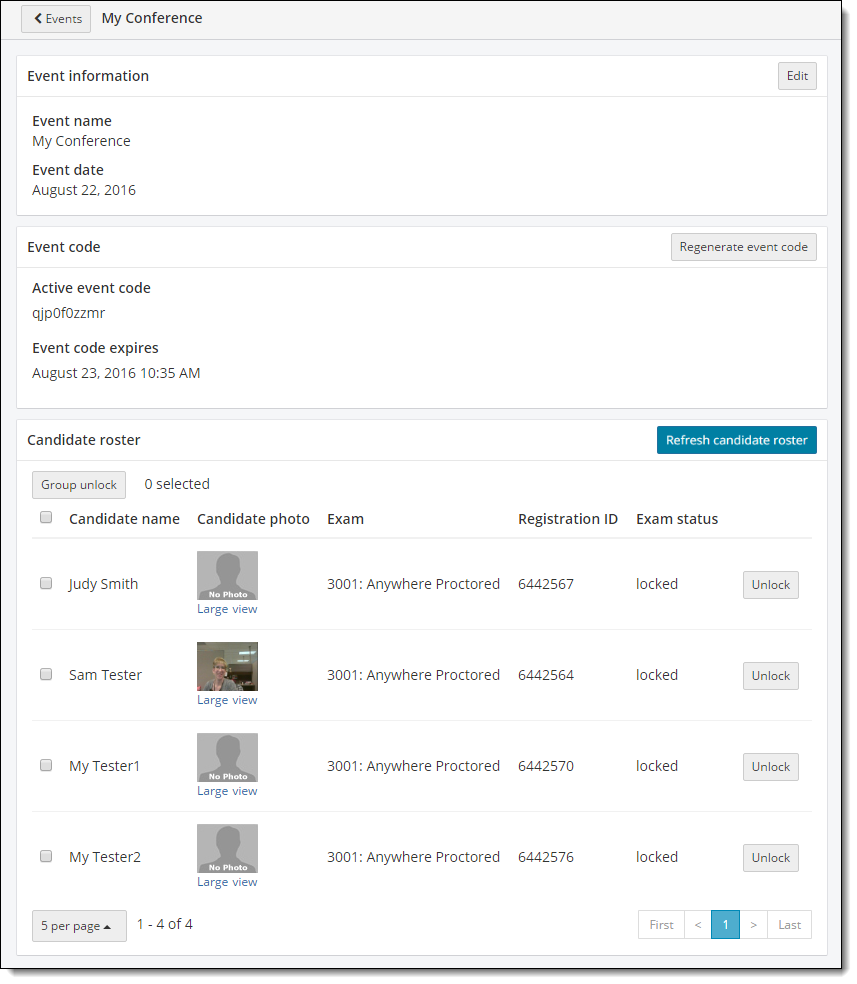 Once you sort the candidate roster by any other column, the locked and unlocked exams are no longer grouped together. If you wish to view the list in the original sort order, return to the Events list and then view the Event again. The sort order from the previous viewing is not retained. |