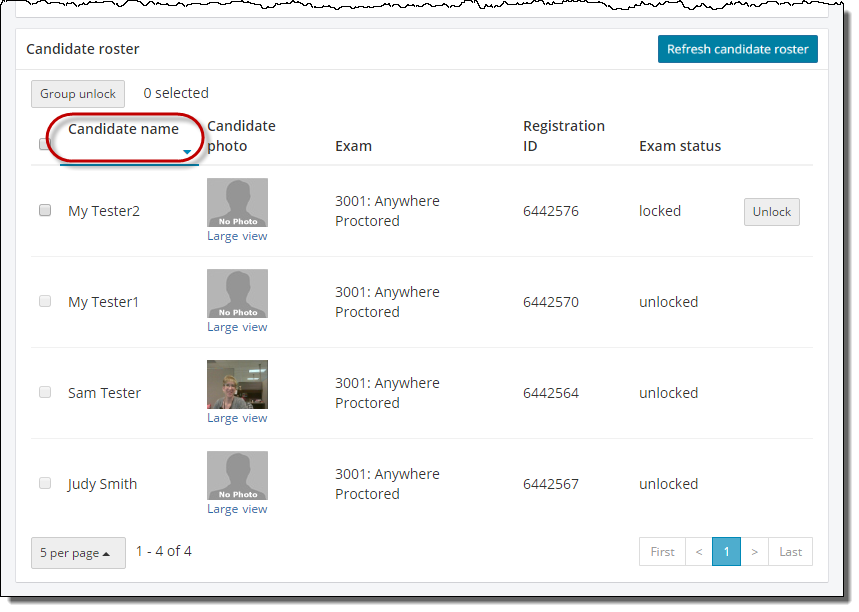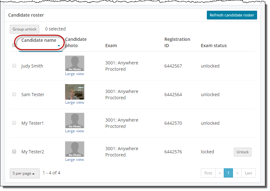 By default, the candidate roster list is sorted alphabetically by Candidate Name with all locked exams listed at the top of the roster and all unlocked exams listed below the locked exams. The Candidate roster may be sorted by Candidate name, Exam, Registration ID, and Exam status.