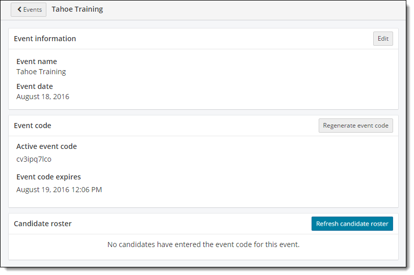 The Event Details page is displayed. The Event information including the event name and event date, the Event code including the current event code, the current event code expiration date and time, and any disabled or expired event codes, and the Candidate roster are displayed.